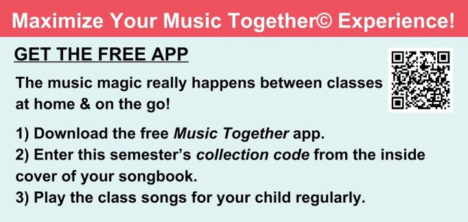 If you haven't downloaded the free Music Together® app from the App Store or Google Play, you'll definitely want to do this so you'll be able to access all of your music from any device. Be sure to check out the Let's Play Tab, make a lullaby playlist, dance party playlist, and more! Be sure to listen to the CURRENT semester of music so your child can get THE MOST out of class. Sing with you soon!